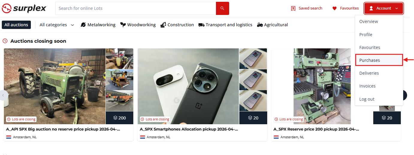 Une fois que vous avez remporté avec succès un article lors d'une enchère, vous pouvez effectuer votre paiement via votre compte Surplex en suivant les étapes ci-dessous.